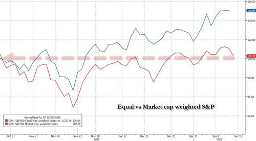 ... while lifting the majority of companies in the S&P 500. While the S&P 500 fell 0.5%. Its equal-weighted version added 0.4%, while the Nasdaq 100 slid 1.1% and the Russell 2000 rose 0.7%.