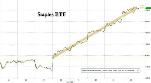 Finally, the staples squeezed again: XLP has traded +7% over the past 5 sessions. Which makes sense since staples were the most sold sector per Goldman Prime Brokerage data last week, so this move higher is likely a squeeze/reversion, along with strength in some of the larger cap names and solid earnings from SMPL and STZ.