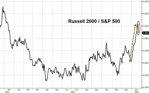 As far as equity markets are concerned, Goldman's trading desk pointed out a "notable change in the narrative today" with the RTY underperforming SPY today for the first time all year (after a record 14 day streak)...