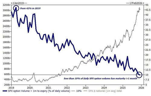 For the first time in history – the amount of real “vega” options (ie, those with a maturity of > 1 month) make up less than 10% of the avg daily volume – for those looking to trade in pockets of the market that are “not crowded,” longer dated convexity is an open lane ...