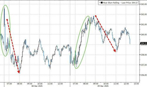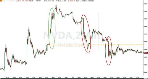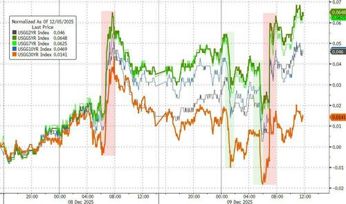 USTreasury yields were higher across the curve with the short-end underperforming (2Y +4bps, 30Y +1bp). As the chart below shows, yields were very choppy today...
