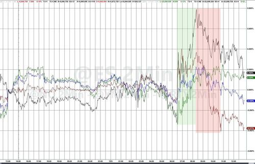 Early gains in equity-land were erased as yields spiked again with The Dow the day's biggest loser. Small Caps managed to outperform most of the day once again but late-day selling pressure (as we also saw yesterday) pushed the S&P ended red (along with The Dow) and Nasdaq warbled around unchanged...