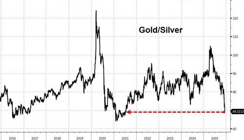 Silver's recent run has massively outperformed gold, dragging the Gold/Silver ratio down to below 70x for the first time since July 2021...