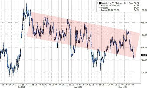 Extending yesterday's pain, today's stronger dollar pushed crude oil prices lower (WTI back below $59, breaking below its 50DMA and to the bottom of its downward trend channel)...
