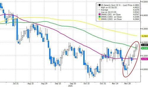 The yield on the 10-year broke above its 100-day moving average on Monday and pushed toward the top of the three-month range - yet the setup into the December FOMC still indicates yields are capped on signs the labor market is rolling over rather than reheating.