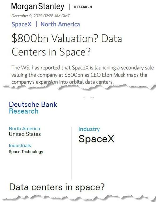 Following SpaceX confirming interest in an IPO next year, reportedly seeking a $1.5 trillion valuation, and Elon Musk expressing strong support for deploying data centers in space, the sellside has started taking a closer look at the concept, with Morgan Stanley and Deutsche Bank publishing almost identical reports days apart.
