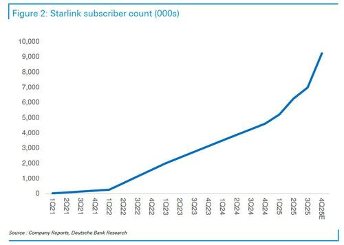 Deutsche Bank forecasts Starlink will break 9 million subscribers exiting 2025E, representing a doubling YoY, once again demonstrating strong momentum and this excludes any D2D users (via MNOs).
