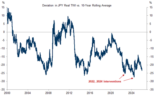 The real trade-weighted Yen remains at less stretched levels than prior to 2022 and 2024 intervention episodes