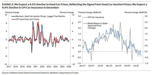 - 1. Shelter. the bank expects a rebound in shelter inflation to slightly below the average monthly pace of Q3 (GS forecast for OER: +0.25%, primary rents: +0.24%), after a methodological feature to assume no inflation in October—when data could not be collected—led shelter inflation to be understated across October and November in the prior report. Goldman does not expect an unwind until April 2026, when the units that were supposed to be surveyed in October are sampled again, and therefore estimate that the core CPI will be understated by 0.1% until then.