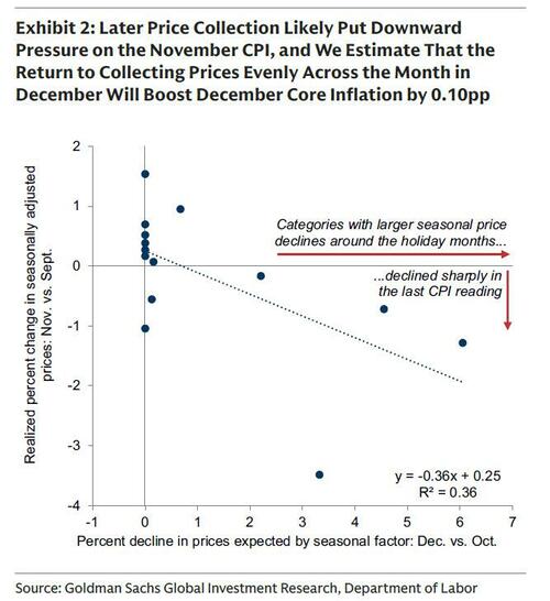 - First, GS expects an unwinding of the negative impact of delayed data collection on the price level in categories that typically experience steep discounting in late November (such as apparel: GS forecast +1.6%; airfares: +5%; and hotels: +3%) worth +0.10pp.