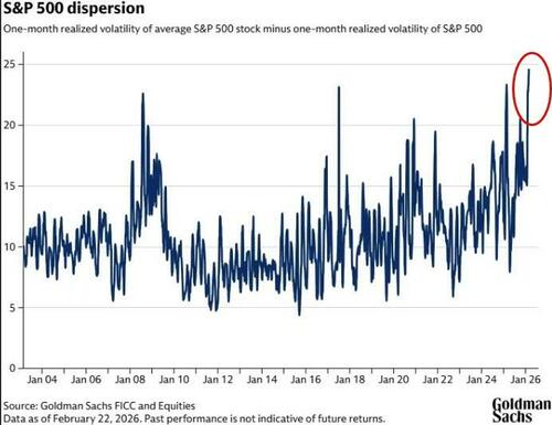 Goldman’s own dispersion index chart below shows, while volatile day to day, there has been a notable upward trend.
