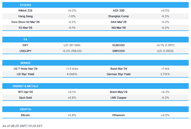 - 10yr JGB futures languished near this week's trough after yesterday's selling pressure and curve steepening on stronger growth prospects after the Takaichi government nominated two staunch reflationists for the BoJ board. There were also recent comments from BoJ officials who reiterated that the basic stance is to continue hiking interest rates if the chances of reaching the BoJ's targets increase, while hawkish dissenter Takata stated that the BoJ should make a further “gear shift” on rates and communicate on the assumption its price target is almost achieved.