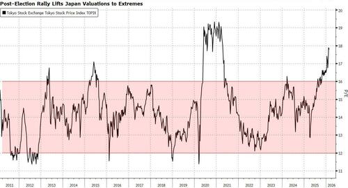 Valuations in Japanese stocks are the highest in decades as a “Buy Japan” rally took off after Prime Minister Sanae Takaichi’s decisive election victory, leading investors to question how much upside remains.