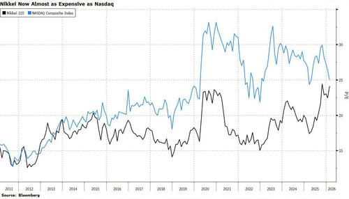 Even more striking is the valuation of the tech-heavy Nikkei 225 Stock Average. Its price to earnings ratio stands at 24.3 times its expected earnings per share, a whisker away from the Nasdaq Composite’s 24.9 multiple — one of the richest valuations among major global equity indexes.