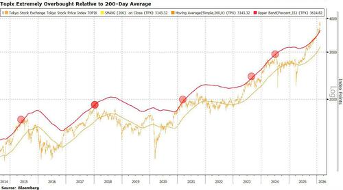 Still, the market looks overbought. The Topix is trading at 21% above its 200-day moving average, way above the 15% mark which often preceded pullbacks in the past.
