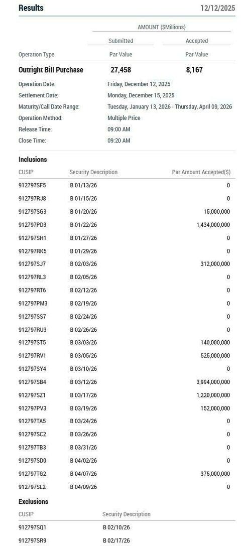 The big shock in last week's FOMC was not that the Fed would cut - after John Wiliams' Nov 20th speech, that was common knowledge. The shock is that the Fed launched QE Lite (aka reserve management purchases), just as we said they would simply by following the clogs in the repo plumbing, yet virtually nobody else echoed our expectation (we were right). What is just as remarkable is that the Fed was expected to start growing its balance sheet some time in late Q1/early Q2 2026, but certainly not this Friday.