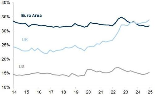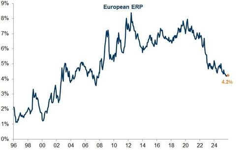 The Equity Risk Premium (ERP) in Europe has dropped to 4.2% compared with an average of 6.7% between 2009 and 2021 – so back to GFC levels in spite of growth having troughed...