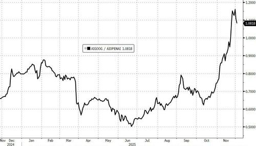 The vicious rotation of Google supply chain over OpenAI's is even more evident in the ratio (Google AI Ecosystem is AVGO, CLS, GOOGL, LITE, and TTMI; OpenAI's is Softbank, AMD, CRWV, MSFT, NVDA, and ORCL):