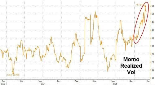 This is the 1-month realized vol of our flagship momentum basket (there are many to choose from). As you can see clearly, since the cycle lows of late 2022, the recent patch was in fact more volatile than the regional banking scare of 2023 or Liberation Day...