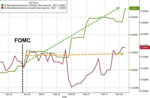 Both growth and inflation data have outperformed since the last FOMC meeting (but as the chart shows, fears are rising over stagflation as the impact of higher energy prices - and tighter financial conditions - could weigh on growth)...