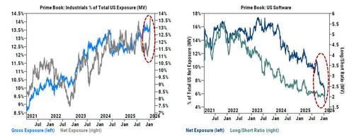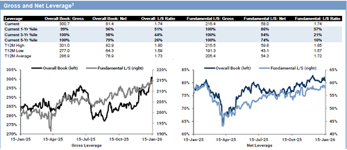 But first some background: echoing what JPMorgan said yesterday, this morning Goldman's Delta-One head, Rich Privorotsky, writes that despite a sudden surge in geopolitical fears, Greenland feels too politically unpopular domestically to end in anything other than a compromise (although it might get worse before it gets better). That's why according to Privo, he is less worried about geopolitics (still one eye on Iran) and more focused on positioning, which is running hot, with gross exposure at 5 year highs and net near 3 year highs.