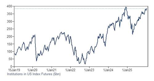 It's not just the prime brokerage where everyone is bulled up: according to Goldman's Futures S&T desk, S&P futures positioning is also at 5y highs, while CTAs are 8 out of 10 long. Some more details below:
