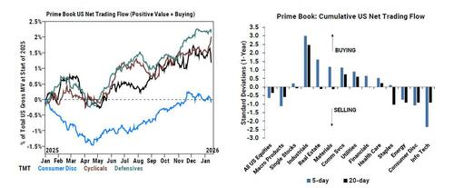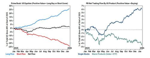 Taking a look at last week's trading flows (Jan 9th – Jan 15th), Goldman PB writes in its must read Weekly Rundown note (available to pro subs), that US equities were net sold this week (-0.6 SDs one-year), driven by short sales in Macro Products outpacing long buys in Single Stocks.
