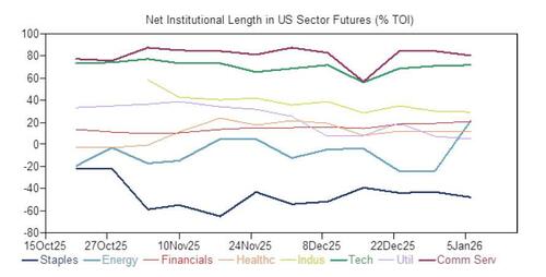 - Separately in US Sector Select Futures, a growing market segment, institutions are longest in Tech and Comm Services, shortest in Staples, and have increased most in Energy and Fins the last 1 month, particularly Energy where the short base has recently collapsed nearly 75%.