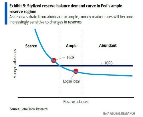 The BofA strategist estimates that the Fed will need to buy at least $20b/m for natural balance sheet growth purposes and an additional $25b/m to reverse the reserve over drain, for at least the first 6 months. Furthermore, the Fed will likely want to maintain flexibility in future guidance on T-bill purchases to adjust for growth in Fed liabilities and demand for reserves over time.