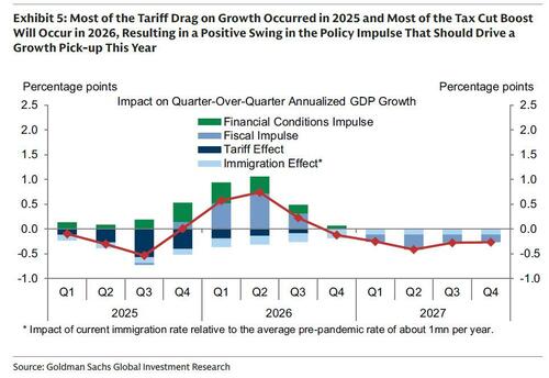 As a result, Goldman's GDP growth forecast for 2026 Q4/Q4 remains 2.5%, with risks tilted a bit to the upside. This would represent a 0.3% acceleration from 2.2% growth in 2025 on a Q4/Q4 basis, in part reflecting the positive swing in the policy impulse shown in Exhibit 5 as the tariff drag gives way to a tax cut boost. While the remaining tariff drag in 2026 shown in the exhibit is now a bit smaller, Goldman's latest immigration assumptions imply a slightly larger drag on growth, and the two changes are roughly offsetting.