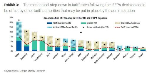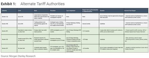 A trade-off between more uncertainty in the near term and a lighter tariff regime in the medium to long term: Morgan Stanley sees an opportunity for the President to alleviate some components of the existing tariff regime over time, but in the nearer term, uncertainty will likely prevail in terms of which authorities will replace the existing tariffs, which sectors/countries will face more legally durable tariffs (Sec. 232/301 after months of investigation), and most importantly, what happens to the bilateral framework deals that are currently in place. That means the broader macro impact could be modest in the context of these two competing factors.