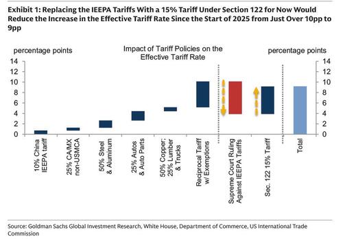 Goldman estimates that the combination of the Supreme Court ruling and the newly announced Sec. 122 tariff will modestly reduce the increase in the effective tariff rate since the start of 2025 from just over 10% to 9%. The policy changes were in line with expectations, and the bank's estimates of the effects of tariffs on inflation and growth are consequently little changed.