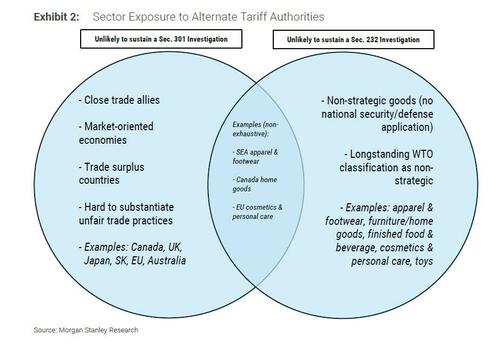 Other paths are available, but potential sector-specific tailwinds are under the surface: President Trump has said he has a backup plan, and members of the administration have suggested that he will leverage other authorities to reimpose the tariffs.And while Trump promptly announced a hike in Section 122 tariffs to first 10% and then 15%, Morgan Stanley still expects the President to pursue a lighter-touch tariff policy under the surface. That means more exceptions, carve-outs, delays, etc., in line with recent steps taken by the administration in the past few months. That could provide a