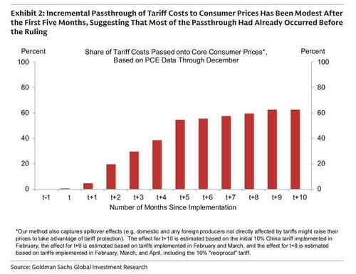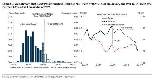 - Goldman's estimates of passthrough from tariff costs to consumer prices suggest that the bulk of the passthrough had already occurred before the Supreme Court ruling. Specifically, the bank believes that tariff passthrough increased core PCE prices by about 0.7% through January (extrapolating from CPI data for January) and will raise prices by a further 0.1% in the remainder of 2026.