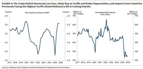 - Imports from countries that will experience meaningful tariff reductions from the latest policy changes are likely to pick up in coming months, but the impact on GDP should be largely offset by increased inventory accumulation and consumption, reduced imports from other countries through which trade had been rerouted, and small reductions in imports from countries whose tariff rate has risen. As an aside, Goldman is launching its Q1 2026 GDP tracking estimate at 3.4%, though this incorporates a 1.3% contribution from the end of the government shutdown in 2025 Q4 (as we calculated on Friday). Goldman also forecasts 2.5% GDP growth for 2026 Q4/Q4, a 0.3% acceleration from 2025 Q4/Q4 that partly reflects the fading drag from tariffs giving way to a boost from tax cuts