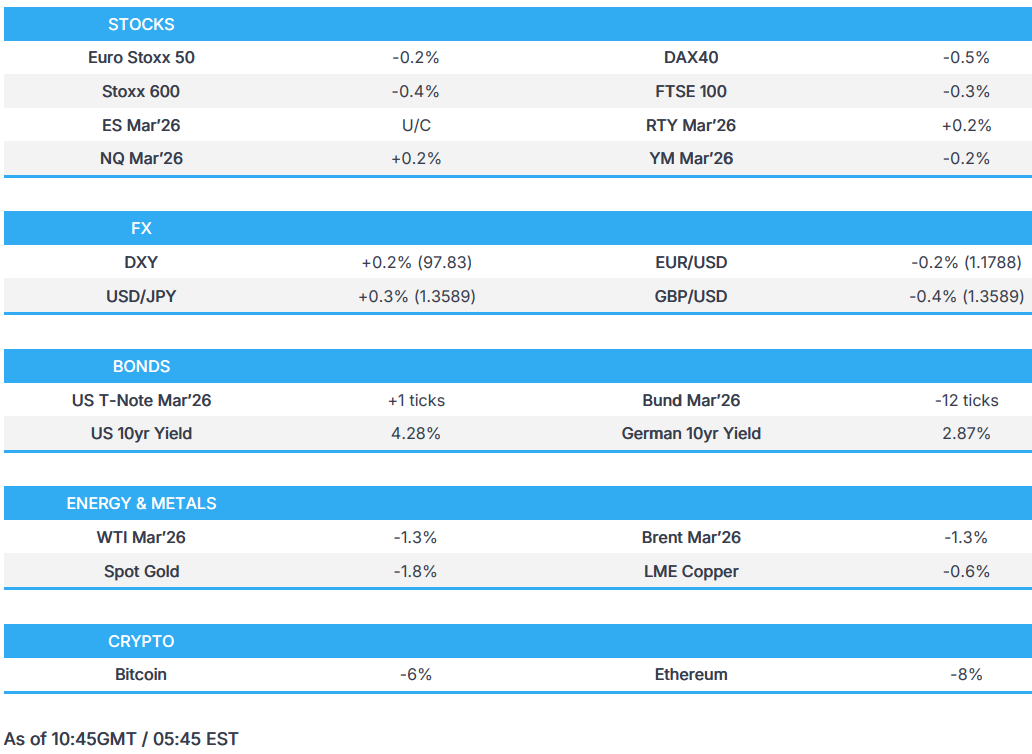- European bourses are broadly on the backfoot; US equity futures mixed, but the NQ outperforms, as chip names benefit from Alphabet boosting AI spending.