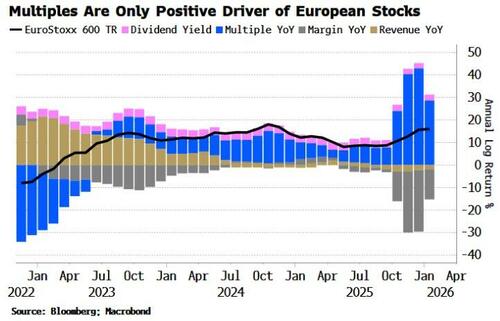 Revenues and profit margins are contributing negatively to annual returns in the EuroStoxx 600, while almost all of the positive contribution is coming from multiples, which have risen 2.5 points since April.