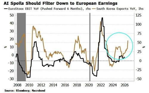 If this relationship persists, then some of the spoils from US spending on AI infrastructure should eventually flow to European shareholders, justifying the work that multiples are currently doing in supporting stock returns.