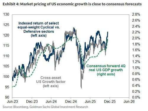 The recent cyclical rally in the US (GS US Cyclical vs Defensives up 13 out of 16 sessions) is pricing a more supportive macro into 2026: growth acceleration, fiscal boost, tariff drag abating, Fed cuts… But we think only a 2% growth acceleration has been priced in, vs our estimates of 2.5%, and our indicators are pointing to a pick up in US non res construction, which is still a notable cyclical underperformer...