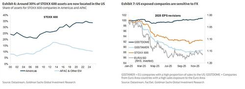 Companies with a high proportion of US and international sales (GSSTAMER) continue to underperform due to euro appreciation, and our FX strategists expect EUR/USD to strengthen further to 1.25 over the next 12 months….