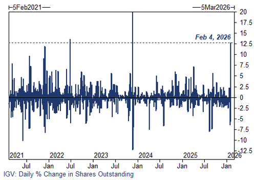 The best news for those seeking the bottom in software is that together with the purge of almost all existing legacy longs in IGV, Goldman has "finally seen buyers of IGV across the institutional community yesterday and today." The fund also registered a 12% increase in shares outstanding on Wednesday (its largest 1-day change since 2023) which "feels like a culmination of outright purchasers trying to find a bottom and potentially participants covering shorts."