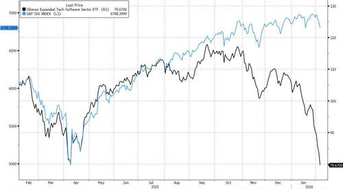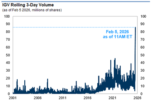 But the biggest incremental news comes from Goldman's ETF desk, which understandably, is focused largely on the ongoing turmoil in the IGV Software ETF. "It has been a very active week for Software stocks, which have plunged by 15% over the past week and 29% from their highs last September. IGV has been the ETF that clients have gravitated towards most for quick and tactical exposure (ETFs as an aggregate are tracking 37% of the tape this morning). The fund has seen back-to-back days of record volumes over its 25-yr tenure, and over 11 million shares have printed on the tape as this note was written (11ET). Said differently, but conveying the same message, over 85+ million shares have traded since Tuesday."