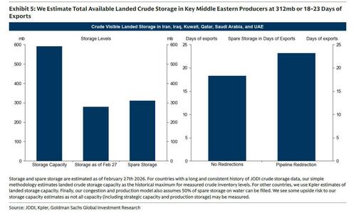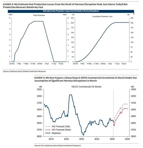 Estimating Production Losses: First, under Goldman's assumption of substantial March Hormuz disruptions, the bank estimates about 200mb of Middle Eastern crude production losses and large draws in OECD commercial inventories in March (-76mb month-over-month vs. prior assumption of 10mb builds).