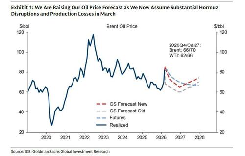The upgrades to Goldman's Brent/WTI year-end/Q4 2026 forecasts are more limited, rising to $66/62 (vs. $60/56 prior) and for 2027 to $70/66 (vs. $65/61 prior) as an assumed Q2 overshoot in Hormuz exports partly replenishes OECD stocks. The bank's forecast that the Brent spot price declines from $82 today to $66 in 2026Q4 reflects: