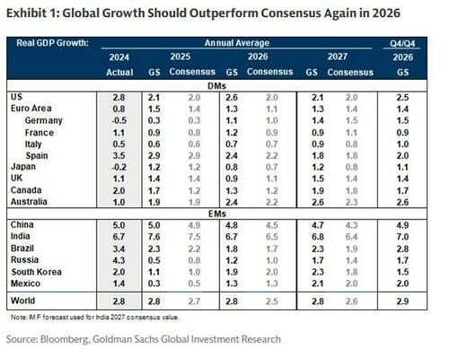 While there’s a lot to get through, as Goldman's Tony Pasquariello noted in his first report of the year, the overarching theme is that the macro backdrop remains conducive for stocks in 2026. Goldman economists expect another year of sturdy global growth of 2.8% in 2026 vs consensus at 2.5%, forecasting continued economic expansion in all regions combined with further modest (and nont so modest) easing by the Fed.