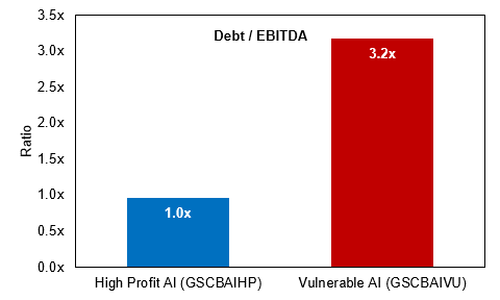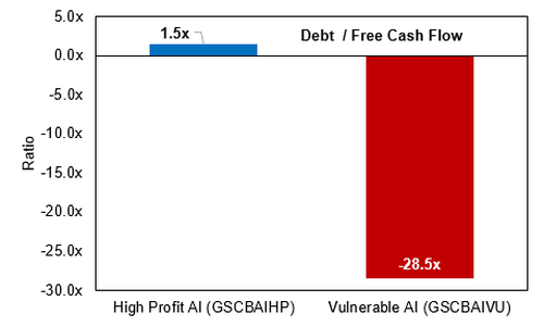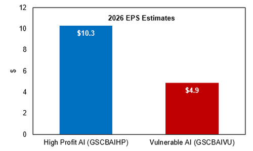 As we reported two months ago (see "Goldman Breaks Down "High Profit" Versus "Vulnerable" AI Stocks"), Goldman split the AI universe into two groups: “High-Profit AI” {GSCBAIHP Index} vs “Vulnerable AI” {GSCBAIVU Index} – using balance sheet strength, credit quality, and free cash flow resilience as factors of differentiation.