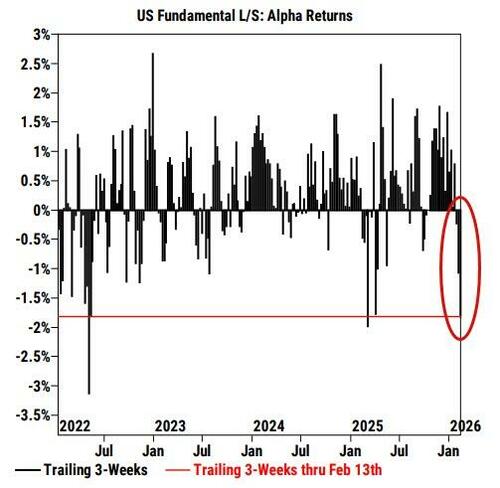 US L/S managers are down -66 bps MTD (+0.8% YTD) and coming into this week had lost ~200 bps of alpha returns since January 27th – the second worst alpha drawdown over a 3-week period since 1H ‘22.