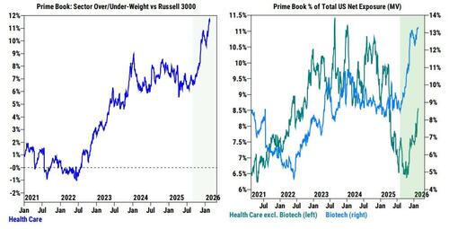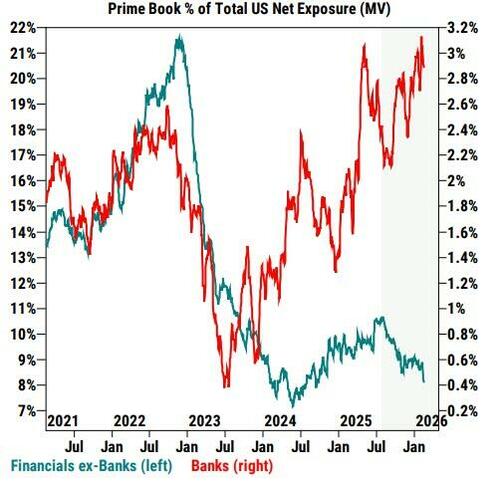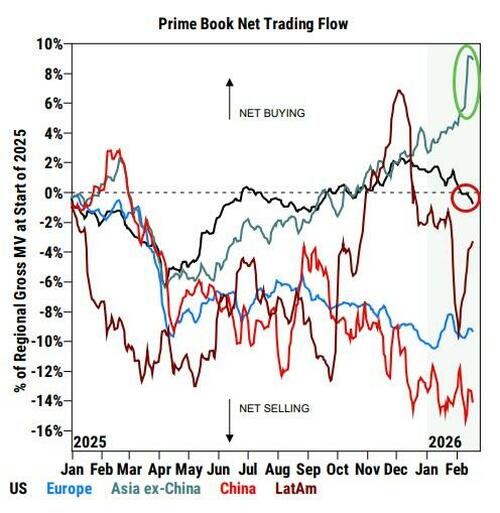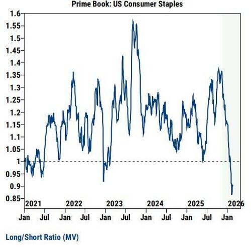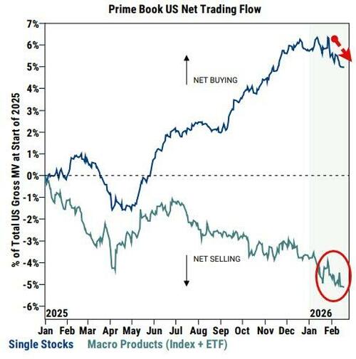 Goldman Sachs traders note that against a more challenging performance backdrop and tougher technicals, hedge funds have turned more defensive and net sold US equities MTD at the fastest pace since Mar ’25.