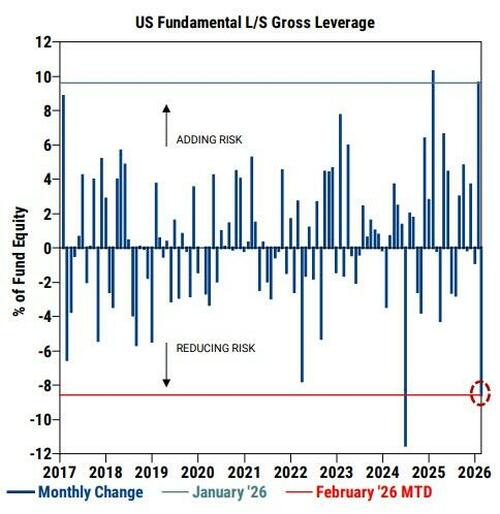 US L/S Gross leverage has fallen -8.6 pts so far in February, which is tracking to be one of the sharpest monthly declines on our record (since 2016) and reversing nearly all of January’s increase...