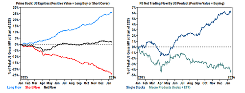 For week ended Jan 15th, Macro Products (Index and ETF combined) saw the largest net selling in 4 weeks (-1.1 SDs one-year), driven entirely by short sales. US-listed ETF shorts decreased -1.1% (still up +8.1% MoM), driven by covering in Large Cap Equity ETFs.